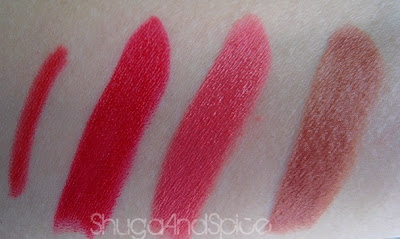 Indoor Lighting Left to Right: Lip Liner Passion -- Lip color Hot -- Fairytale -- Sultry |